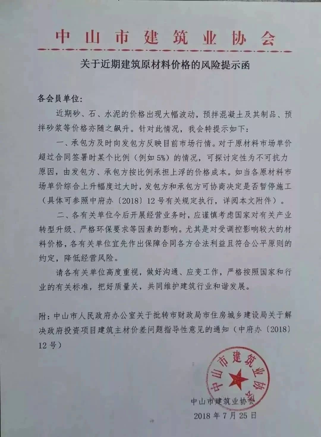 7月31日,佛山市住建管理局下發了《關于加強建筑材料價格風險管控有關事項的通知》,提出: