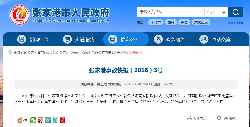 2018年2月6日,張家港海螺水泥有限公司將原材料庫清庫作業發包給河南省防腐保溫開發有限公司。河南防腐公司清庫工姚蓋等4人在粉末庫內進行庫壁清灰作業,14時30分左右,姚蓋作業時不慎墜落至庫底(墜落高度3米),陷在庫底灰沙中,救出時已死亡。