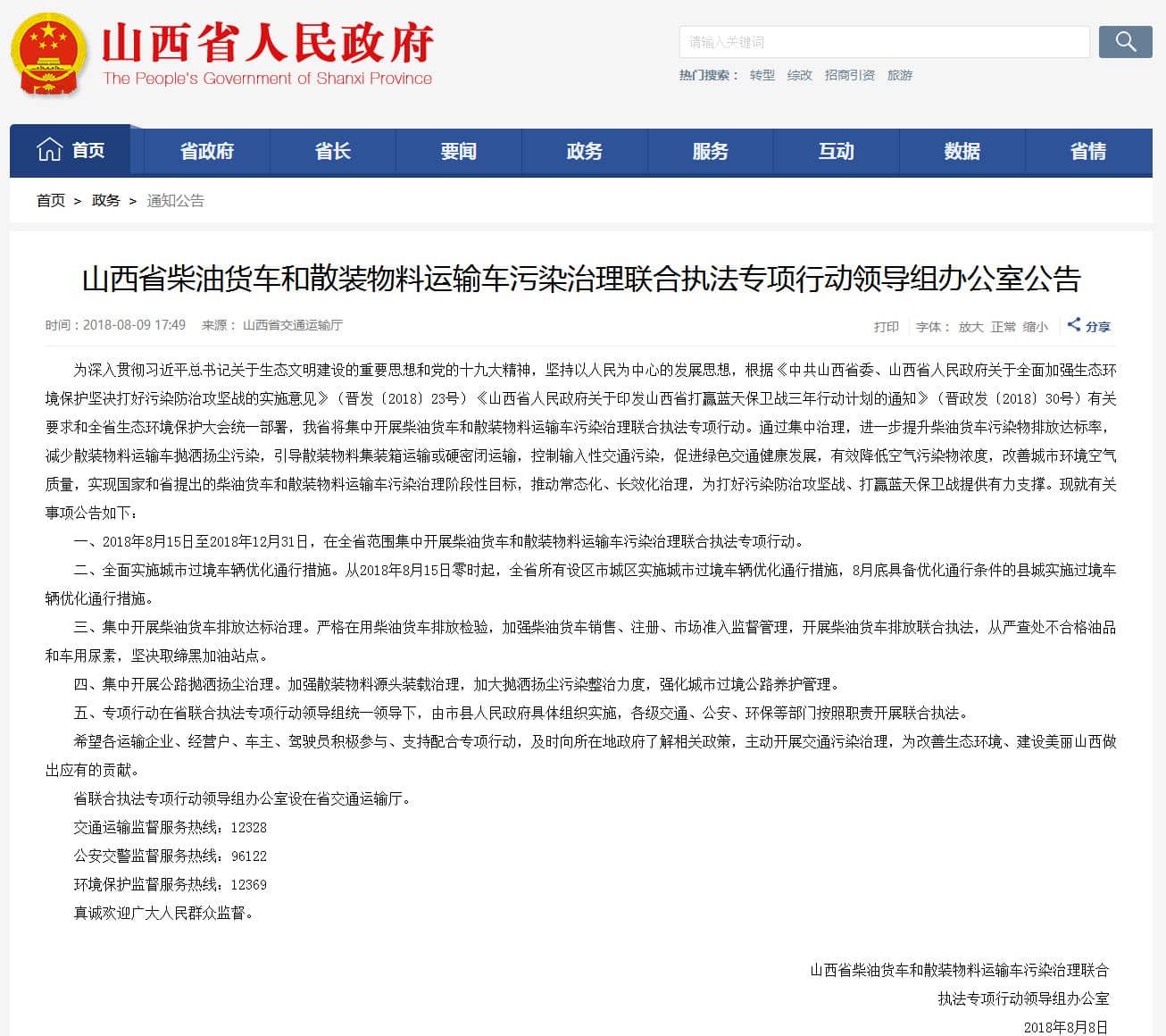 【水泥人網】近日山西省正式啟動多部門聯動整治交通污染專項行動。據了解,本次專項行動分三個階段實施,8月15日前為準備啟動階段,主要任務是做好組織領導、制定方案、組建隊伍等準備工作,為開展專項行動奠定堅實基礎。8月15日到年底為集中治理階段,主要任務是抓住“車、路、油”三個環節,組織開展交通、公安、環保等部門聯合執法,重點整治柴油貨車超標排放和散裝物料運輸車輛密閉不嚴、沿路拋灑以及道路揚塵污染,優化重型貨車和散裝物料運輸車輛過境城區通行路線,有效降低交通污染。
