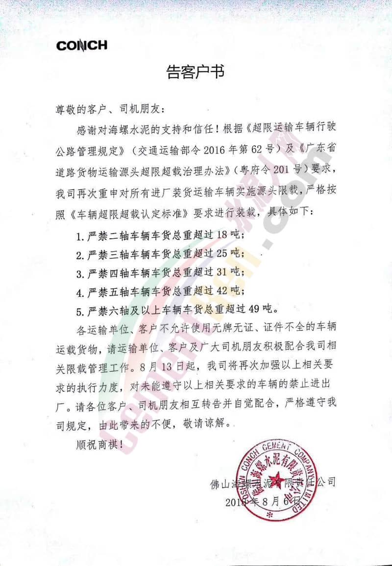 日前,佛山海螺水泥有限責任公司發布《告客戶書》稱,根據《超限運輸車輛行駛公路管理規定》(交通運輸部令2016年第62號)要求,公司再次重申對所有進廠裝貨運輸車輛實施源頭限載,嚴格按照《車輛超限超載認定標準》要求進行裝載。