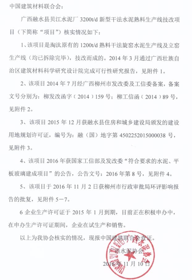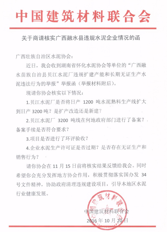 對此,懷化水泥協(xié)會于2016年10月12日,向中國建材聯(lián)合會及國家有關(guān)部門舉報了該公司的違法違規(guī)行為,得到了中國建材聯(lián)合會的高度重視,并于2016年10月20日向廣西自治區(qū)水泥協(xié)會發(fā)出了《關(guān)于商請核實廣西融水縣違規(guī)水泥企業(yè)情況的函》(見附件三)。