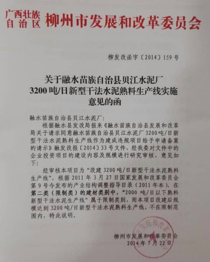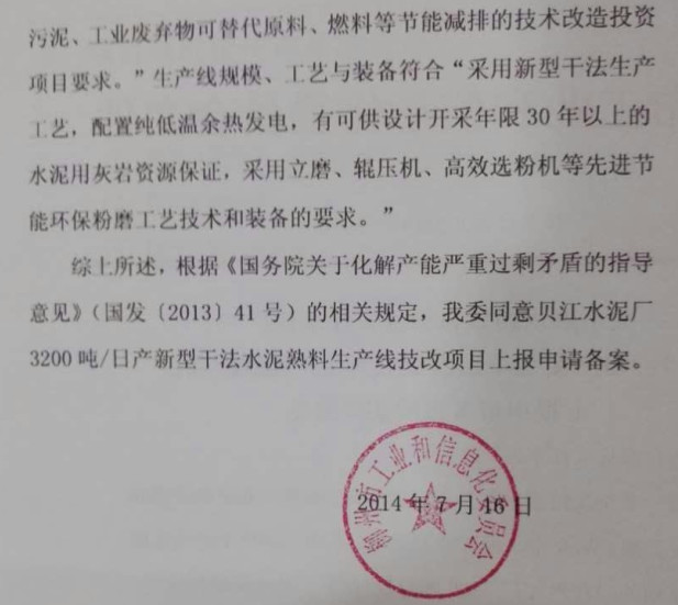 2、請求水泥生產(chǎn)許可證審查部,依法依規(guī)不再受理貝江水泥有限公司的生產(chǎn)許可證申報資料。