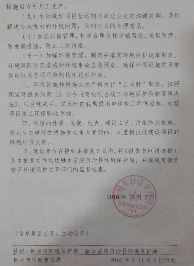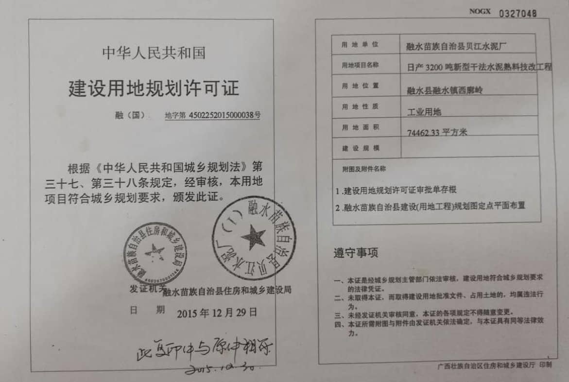從廣西水泥協(xié)會2016年11月10日給聯(lián)合會的回復(fù)函中(見附件四),可以看到,這個技改項目是在2014年8月20日正式投產(chǎn)前的一個月,才分別于7月16日和7月22日,到柳州市經(jīng)信委和發(fā)改委進行備案。柳州市工信委只是出具了一個《初審意見》(見附件五),柳州市發(fā)改委出具的則只是一個帶證明性質(zhì)的《意見函》(見附件六),根本沒有獲得省級政府主管部門以上的技改核準文件;而且建設(shè)用地規(guī)劃許可證,是在投產(chǎn)后一年多以后的2015年12月29日才獲得批準的(見附件七);環(huán)境影響報告書也是到投產(chǎn)兩年多以后的2016年11月2日,才得到柳州市行政審批局的批復(fù)文件(見附件八)。