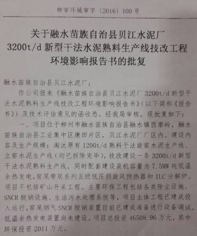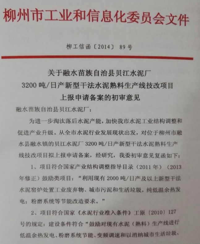 1、強行技改,違規(guī)擴建。融水縣貝江水泥有限公司原來是一條日產(chǎn)1200噸熟料的水泥生產(chǎn)線。2013年,該公司在沒有獲得廣西自治區(qū)經(jīng)信委的核準文件,沒有獲得建設(shè)項目用地批文,沒有獲得環(huán)境影響報告書批復(fù)等必備手續(xù)的情況下,借技改之名,擅自將日產(chǎn)1200噸生產(chǎn)線擴大到日產(chǎn)3200噸。在項目的擴建期間,國務(wù)院國發(fā)〔2013〕41號文件明文規(guī)定“各地方、各部門不得以任何名義、任何方式核準、備案產(chǎn)能嚴重過剩行業(yè)新增產(chǎn)能項目”;國家發(fā)改委、工信部發(fā)改產(chǎn)業(yè)[2013]892號文件三令五申“對未批先建、邊批邊建、越權(quán)核準的違規(guī)項目,尚未開工建設(shè)的,不準開工,正在建設(shè)的項目,要停止建設(shè)”。但是該公司對國家三令五申的產(chǎn)業(yè)政策和法律法規(guī)置若罔聞,仍然我行我素,強行技改,并于2014年8月20日強行投產(chǎn)。