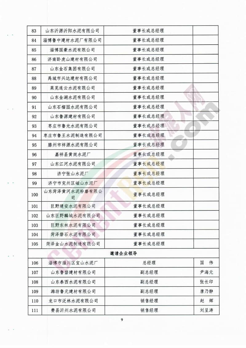 參加會議的主要領導和代表有山東省經信委副主任王超英,中國水泥協會常務副會長孔祥忠,中國水泥協會副會長秘書長、中聯水泥集團黨委書記、董事長崔星太,山東省環保廳大氣污染防治處處長肖紅,山東省社會組織管理局副局長邢洪銳,中國水泥協會副會長、中聯水泥集團總經理孫建成,山東建材工業協會會長李峰、山東省水泥行業協會會長趙利平等。