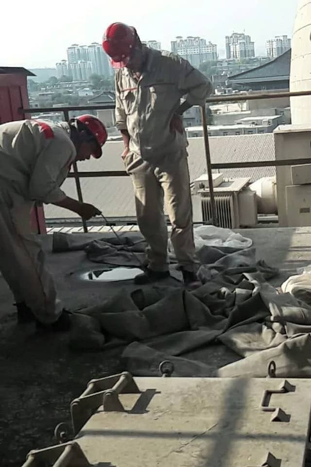 他們頂著高溫暴曬,打開收塵器蓋子,進入3米多深的袋室內,對12個袋室不同位置進行逐室檢查。袋室內高溫缺氧、布滿粉塵,現場溫度已達70℃,在里面作業20分鐘就必須出來透風,一會又重新下去檢查。