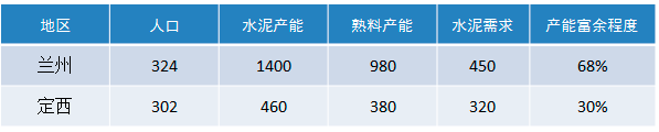 定西市共有三家水泥企業,熟料產能380萬噸、水泥產能460萬噸;水泥市場需求合計約320萬噸,產能富余程度30%。