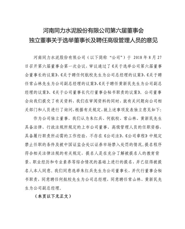 【水泥人網】8月27日晚間,同力水泥(000885)發布公告,公司于當日召開2018年第二次臨時股東大會及第六屆董事會第一次會議,選舉朱紅兵為同力水泥第六屆董事會董事長。聘任何航校為同力水泥總經理,聘任常山林、黃新民為同力水泥副總經理。董事會秘書、證券事務代表人選已選定,待獲得深圳證券交易所相關資格后聘任,根據深交所有關規定,暫由董事長代為履行董事會秘書職責。