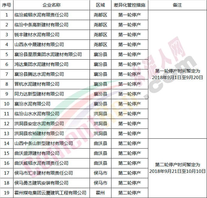 第一輪停產時間暫定為9月1日~9月20日為,管控區域為堯都區、襄汾縣、洪洞縣等。