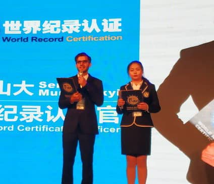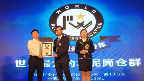 在活動現場,世界紀錄認證官亞歷山大公布了位于北京塞隆國際文化創意園的46座水泥筒倉群建筑被世界紀錄認證機構認定為“世界最大的水泥筒倉群”,并頒發證書。現場大屏幕播放了紀錄片,顯示了46座水泥筒倉群經過前期申請、現場測量、數據確認等認證流程。