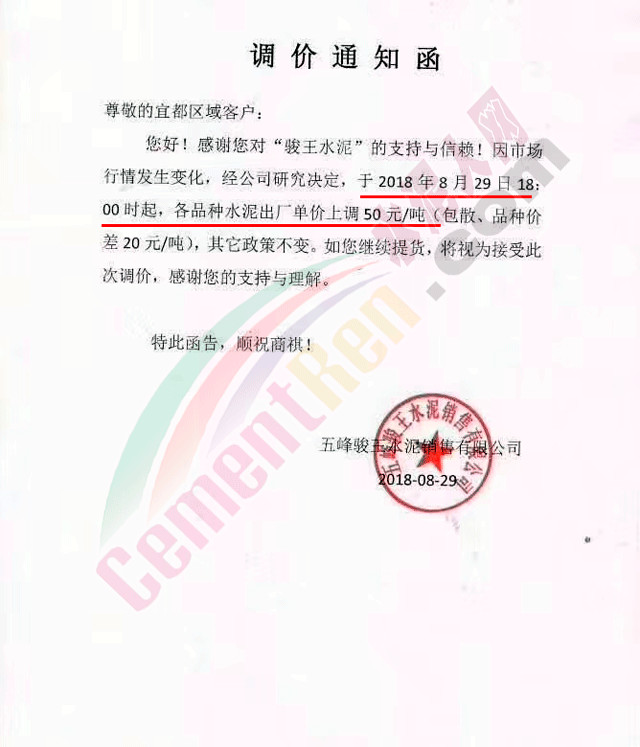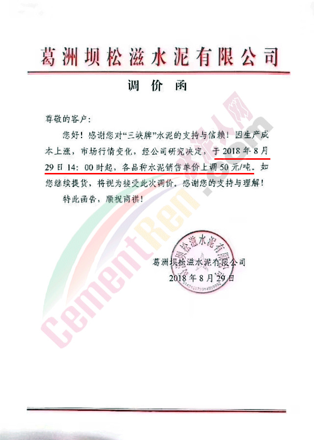 【水泥人網】8月29日湖北華新水泥(長陽)、華新水泥(秭歸)、葛洲壩松滋、葛洲壩當陽等水泥企業發布漲價通知稱上調水泥價格,上調幅度50元/噸。調價通知如下: