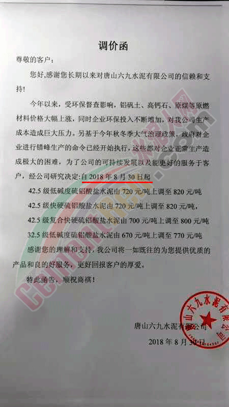昨日,唐山六九水泥發布調價函稱,今年以來,受環保督查影響原材料及煤炭原燃材料價格大幅上漲,同時企業環保投入不斷增加。對公司生產成本造成巨大壓力。另基于今年秋冬大氣治理政策,政府對企業進行錯峰生產的命令已經開始執行,這些都對企業正常生產造成極大的困難,為了公司的可持續發展,經公司研究決定自8月30日起上調42.5級水泥價格,各類型產品價格上調100元/噸。調價函原文如下: