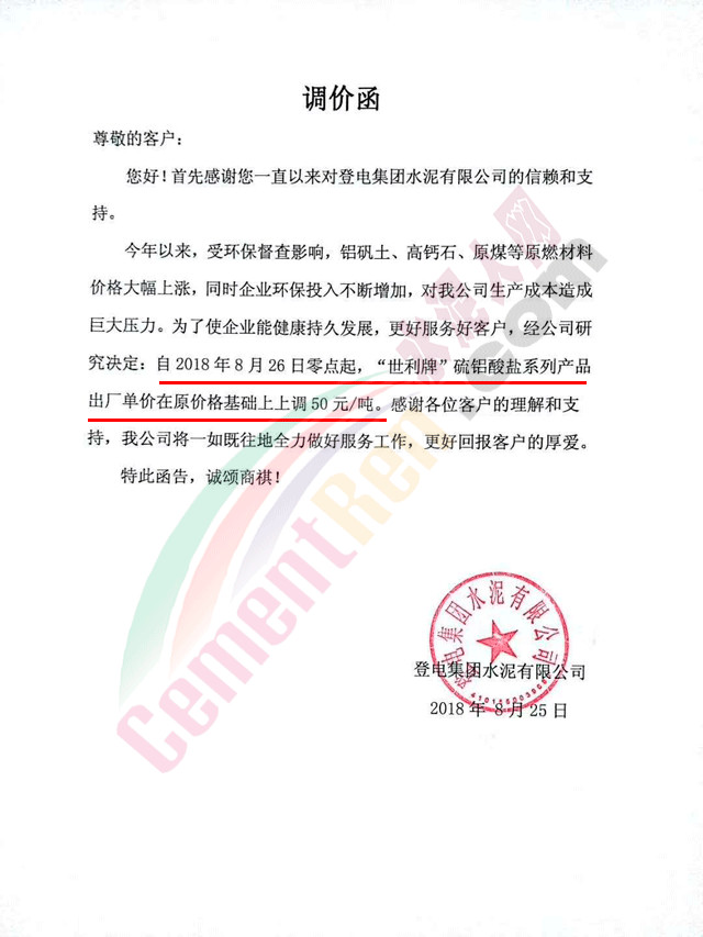 25日發調價函通知客戶自8月26日零點起,“世利牌“硫鋁酸鹽系列產品出廠單價在原價格基礎上上調50元/噸。