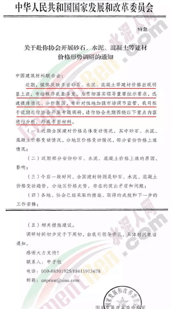 國家發展改革委價格司于9月5日發特急文件給中國建筑材料聯合會稱:近期媒體反映多省砂石、水泥、混凝土等建材價格出現明顯上漲,市場秩序亂象多發。為貫徹落實領導重要批示要求,迅速摸清情況、分析原因,有針對性的加強市場調節監管,國家發展改革委價格司擬于近期赴中國建筑材料聯合會開展專題調研,請中國建筑材料聯合會先期圍繞以下重點內容進行分析,形成書面材料。