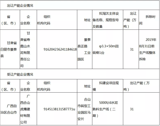 公告稱,按照《國務院關于化解產能嚴重過剩矛盾的指導意見》(國發〔2013〕41號)、《國務院辦公廳關于促進建材工業穩增長調結構增效益的指導意見》(國辦發〔2016〕34號)、《工業和信息化部關于印發鋼鐵水泥玻璃行業產能置換實施辦法的通知》(工信部產業〔2017〕337號)和《甘肅省工業和信息化委員會關于做好鋼鐵水泥等行業產能置換工作的通知》(甘工信發〔2018〕241號)要求,經公示無異議,將甘肅壽鹿山水泥有限責任公司水泥熟料產能出讓情況予以公告,歡迎社會公眾進行監督。