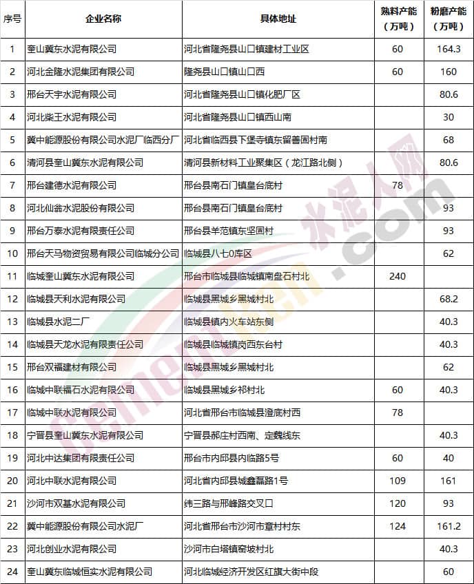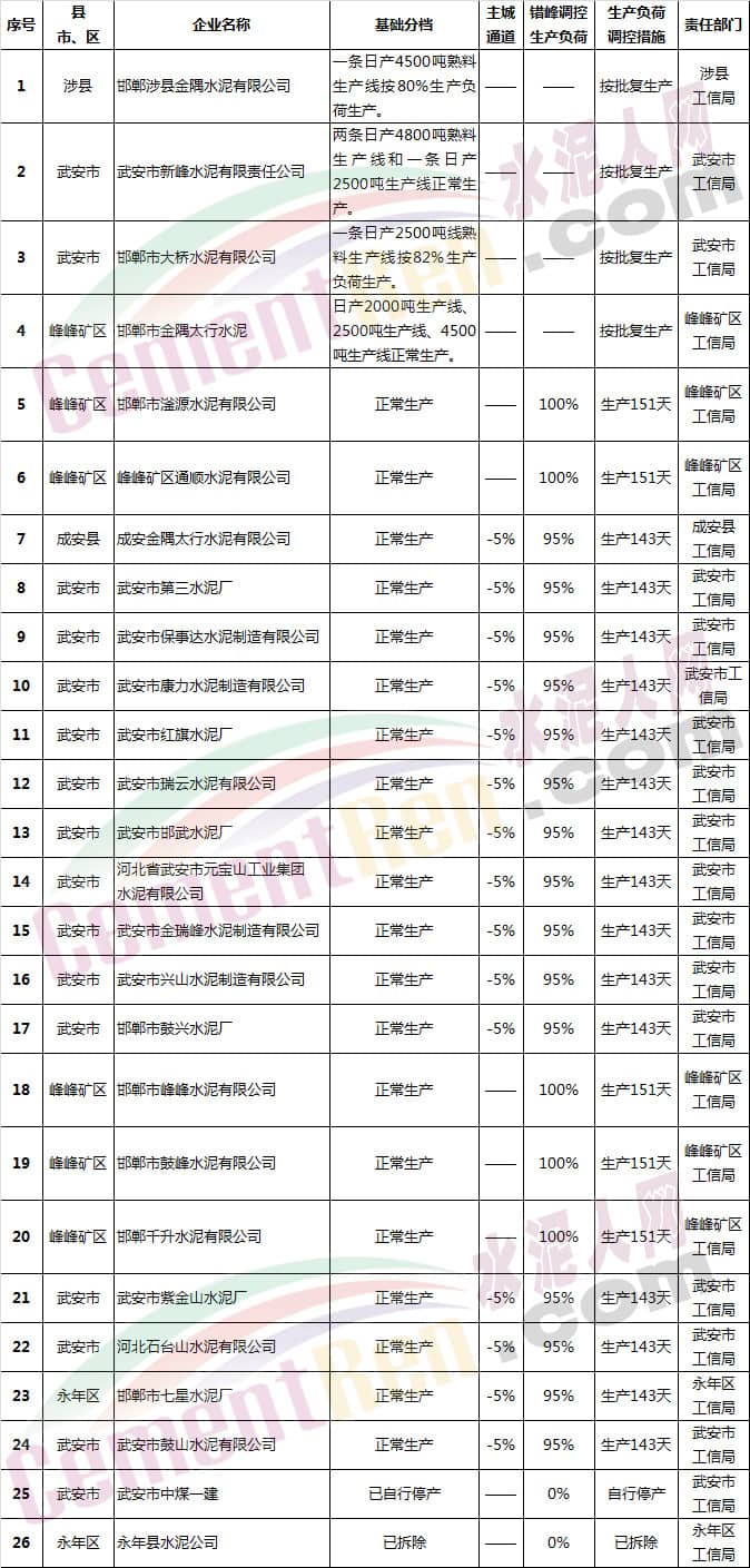 (一)水泥企業(不含粉磨站)除承擔居民供暖、協同處置城市垃圾或危險廢物及高速公路重點建設項目等保民生任務的,要根據承擔任務量核定最大允許生產負荷外,其余企業錯峰期間全部停產,在2018年9月底前報邯鄲市人民政府備案。水泥粉磨站按通用指標進行績效評價,最終確定企業采暖季錯峰生產方案。9月底未按標準驗收合格的企業停產。