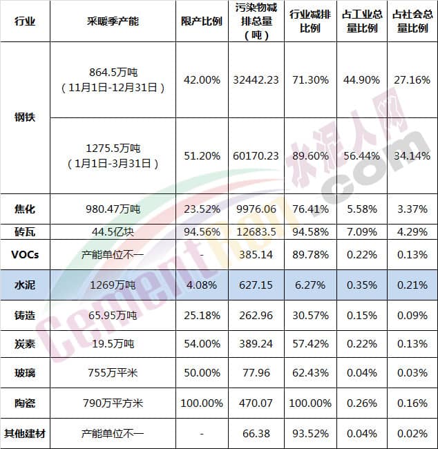 水泥行業(不含粉磨站)根據承擔居民供暖、協同處置城市垃圾或危險廢物及高速公路重點建設項目等保民生任務量核定最大允許生產負荷外,其余企業錯峰期間全部停產,行業限產比例4.08%。