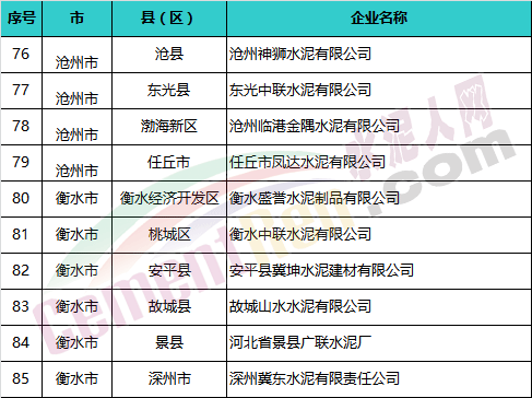 日前,河北公布2018年河北省重點排污單位名錄。2018年河北省重點排污單位共3403家,涉及大氣環境、水環境等排污單位。其中包括金隅水泥、冀東水泥、中聯水泥、京蘭水泥、新峰水泥等80多家水泥企業。詳細名單如下:
