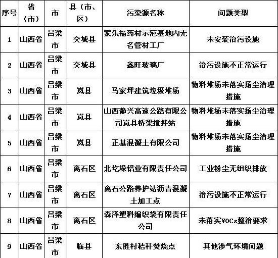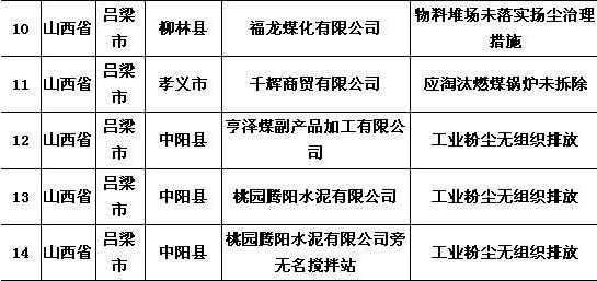 其中,山西省晉中市昔陽縣1家(排氣筒高度不足15米),臨汾市安澤縣1家(排氣筒高度不足15米),運城市臨猗縣1家(煙囪高度不足35米)、夏縣1家(排氣筒高度不足15米);河南省洛陽市西工區1家(排氣筒高度不足15米)企業廢氣排放口設置未達到環評要求。