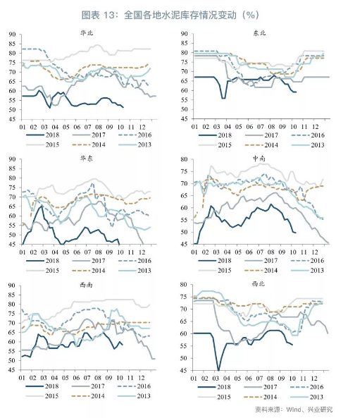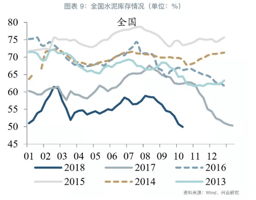 水泥:興業研究水泥景氣度指標顯示當前水泥仍處高景氣度區間,本月水泥整體表現較好,量價齊升,但區域之間仍有所分化,華東和中南地區仍表現較好,西北和東北地區受需求端低迷拖累景氣度難有起色。展望后市,本月固定資產投資有企穩跡象,但基建投資持續下滑,考慮政府在基建投資的發力,財政政策和貨幣政策持續寬松,預計基建投資復蘇可期。而且從短期來看,10月下旬全國多數地區適宜開工,水泥庫存處于歷史低位,短期水泥高景氣度仍然持續,但受環保高壓有所放松影響,中期內承壓。