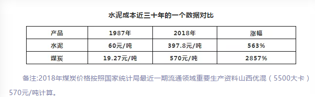 根據上表數據顯示,30年前水泥價格是煤炭的3.1倍。按照30年前煤炭價格至今漲幅來計算,今天的水泥價格應該在1774元/噸才算合理。