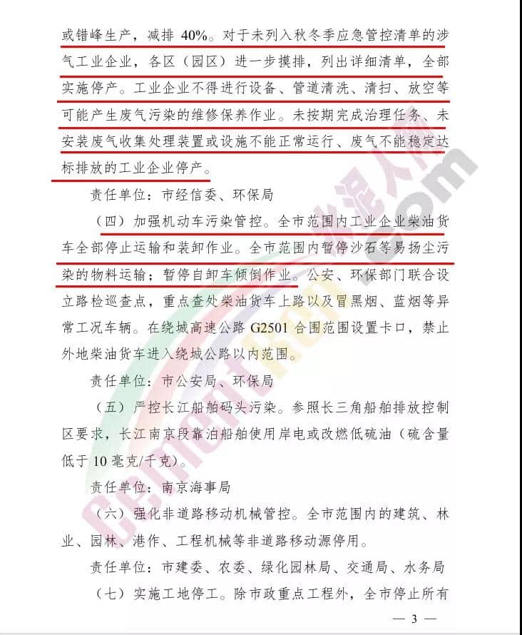 同時要加強機動車污染管控,全市范圍內工業企業柴油貨車全部停止運輸和作業作裝卸作業。全市范圍內暫停沙石等易揚塵污染的物料運輸;暫停自卸車傾倒作業。停止碼頭船舶易揚塵物料裝卸。暫停長江南京段碼頭和船舶產生大氣污染的裝卸作用,減少大氣污染物排放。全市范圍內暫停碼頭和船舶煤炭、礦石、砂石等易產生揚塵物料的裝卸作業。
