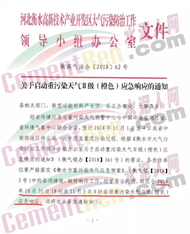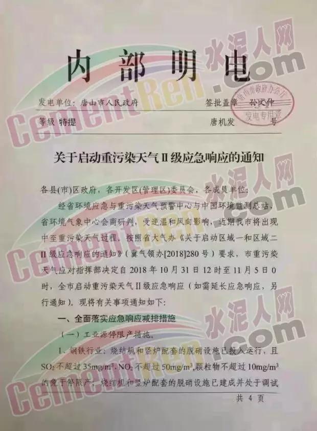 唐山市人民政府昨日(31日)也發布《關于重污染天氣II級應急響應的通知》,該通知稱,經省環境應急與重污染天氣預警中心與中國環境監測總站、省環境氣象中心會商研判,近期,唐山市將出現中至重污染天氣過程,按照省大氣辦《關于啟動區域一和區域二II級應急響應的通知》要求,市重污染天氣應對指揮部決定自2018年10月31日12時至11月5日0時,全市啟動重污染天氣II級應急響應。要求水泥(含特種水泥、粉磨站)等企業全部停產。