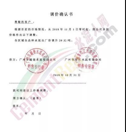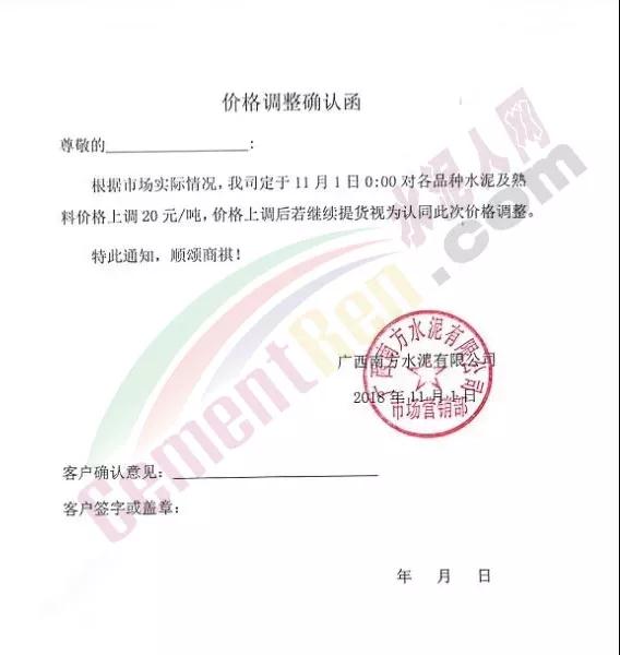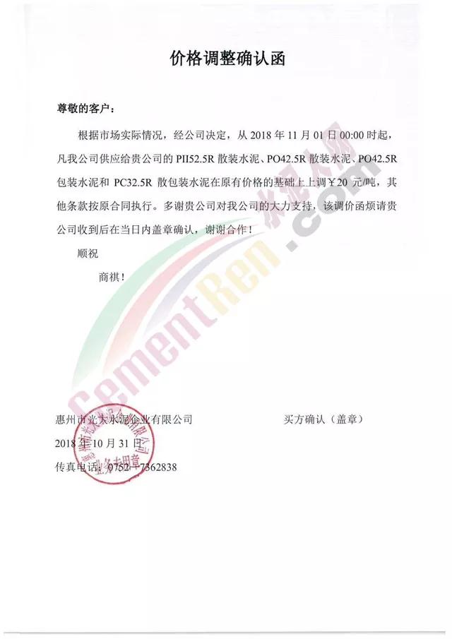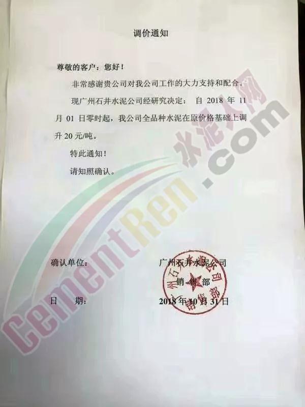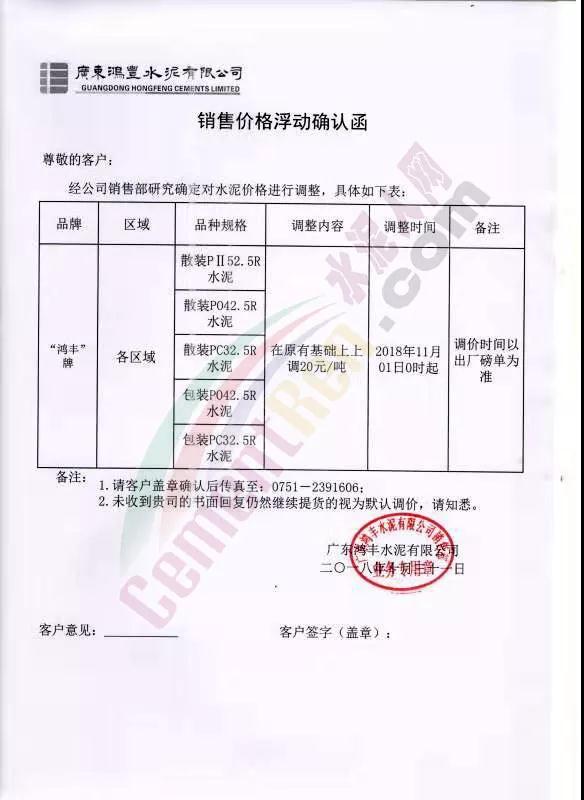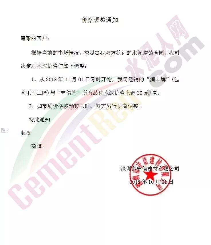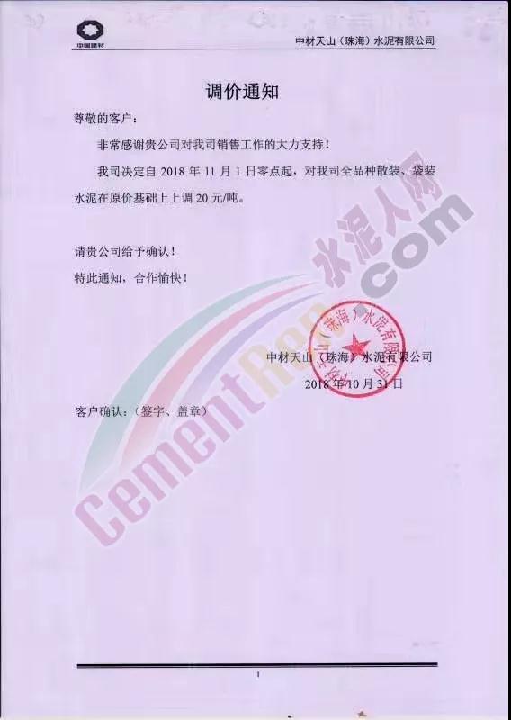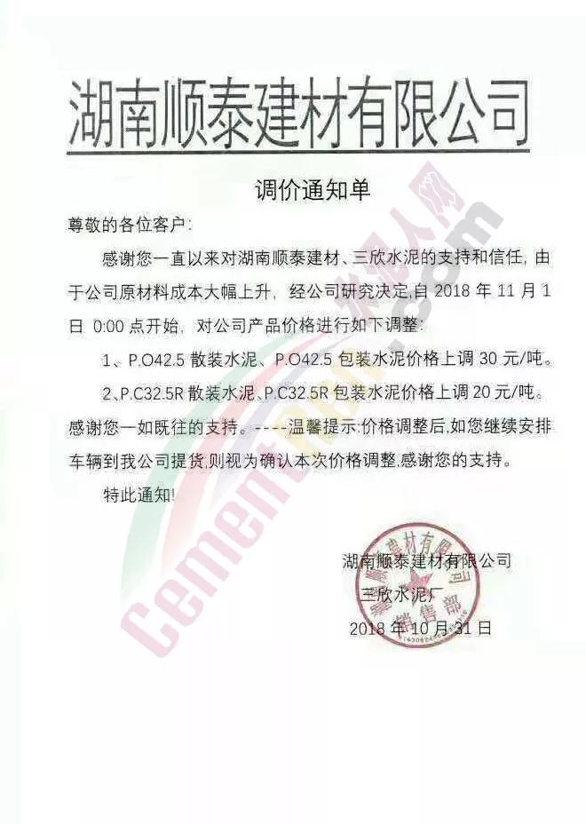 由于原材料價格上漲,公司經營成本上升,結合當前市場行情變化,經公司研究決定于2018年11月1日0:00時開始對隆回區域各品種水泥、熟料價格上調30元/噸。溫馨提示:價格調整后,如您繼續安排車輛到我公司提貨,則視為確認本次價格調整,感謝您的支持,特此通知! 【邵陽海螺銷售處】