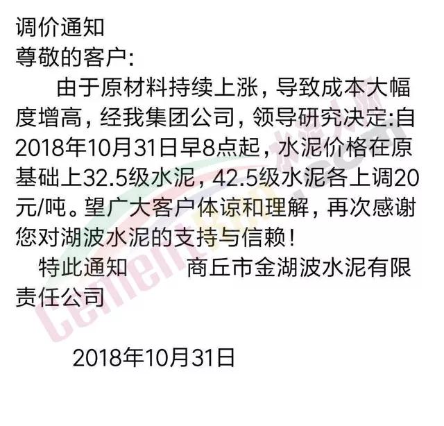 同期發布漲價通知的還有河南區域的金湖波水泥。