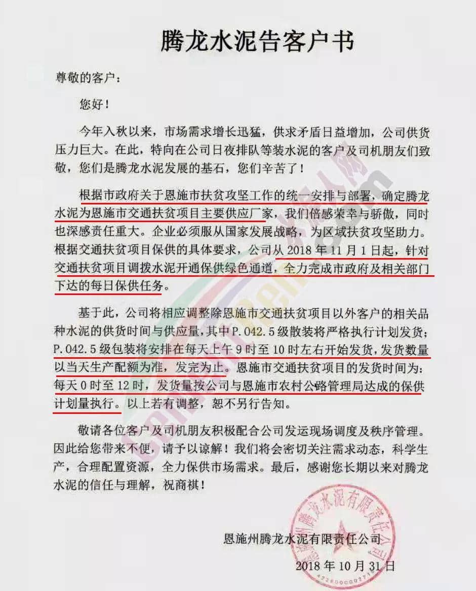 同一天,湖北恩施騰龍水泥告知下游客戶,今年入秋以來市場需求增長迅猛,供求矛盾日益增加,公司供貨壓力巨大。同時,根據市政府關于恩施市扶貧攻堅工作的統一安排與部署,確定騰龍水泥為恩施市交通扶貧項目主要供應廠家,為保證交通扶貧項目從2018年11月1日起,針對交通扶貧項目調拔水泥開通保供綠色通道,全力完成市政府及相關部門下達的每日保供任務。