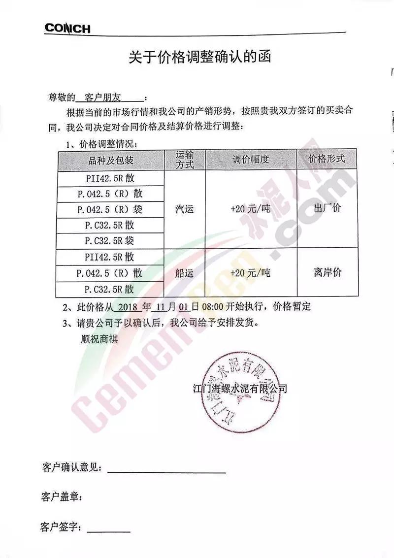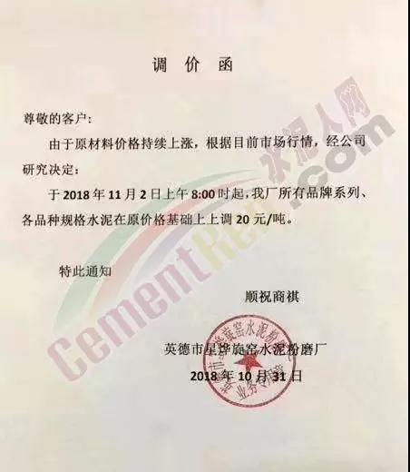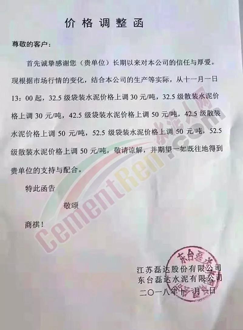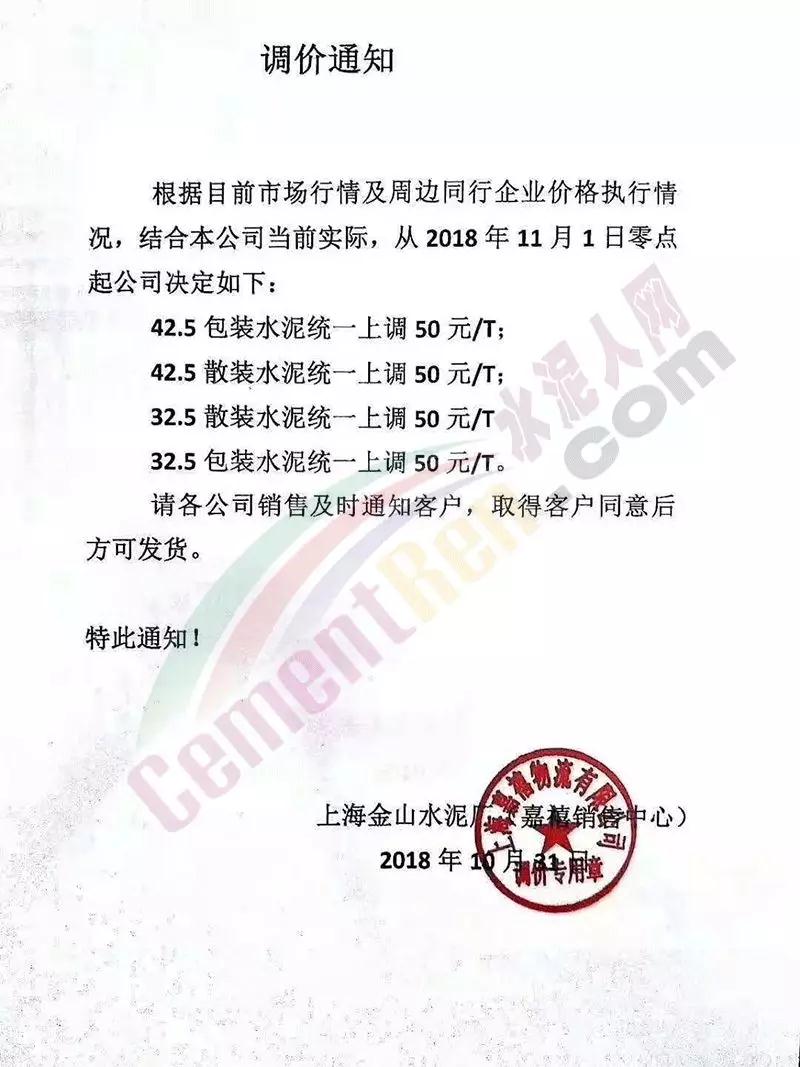 昨日(11月1日)南京海中貿易公司發布提價通知,各標號水泥價格上調30-50元/噸。