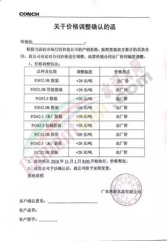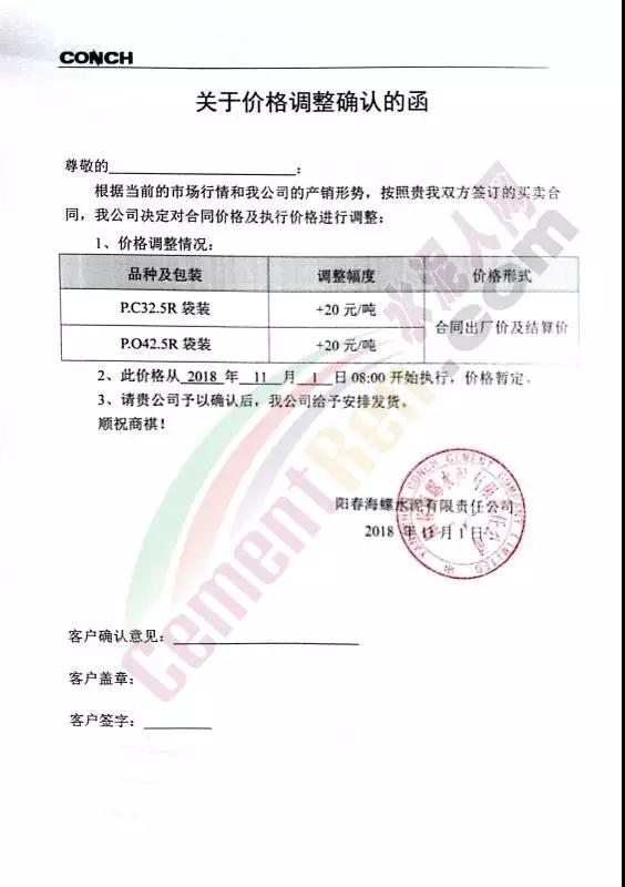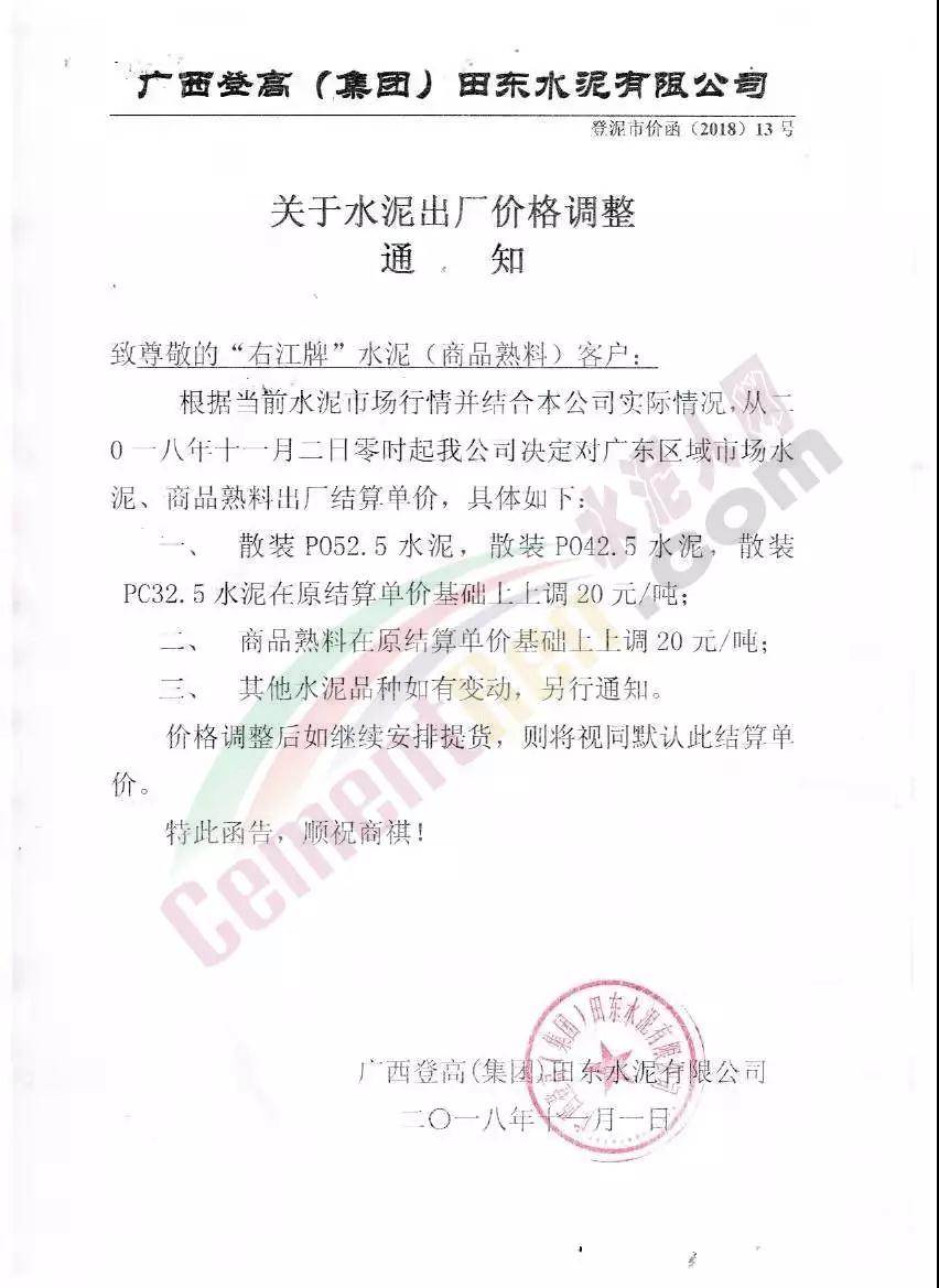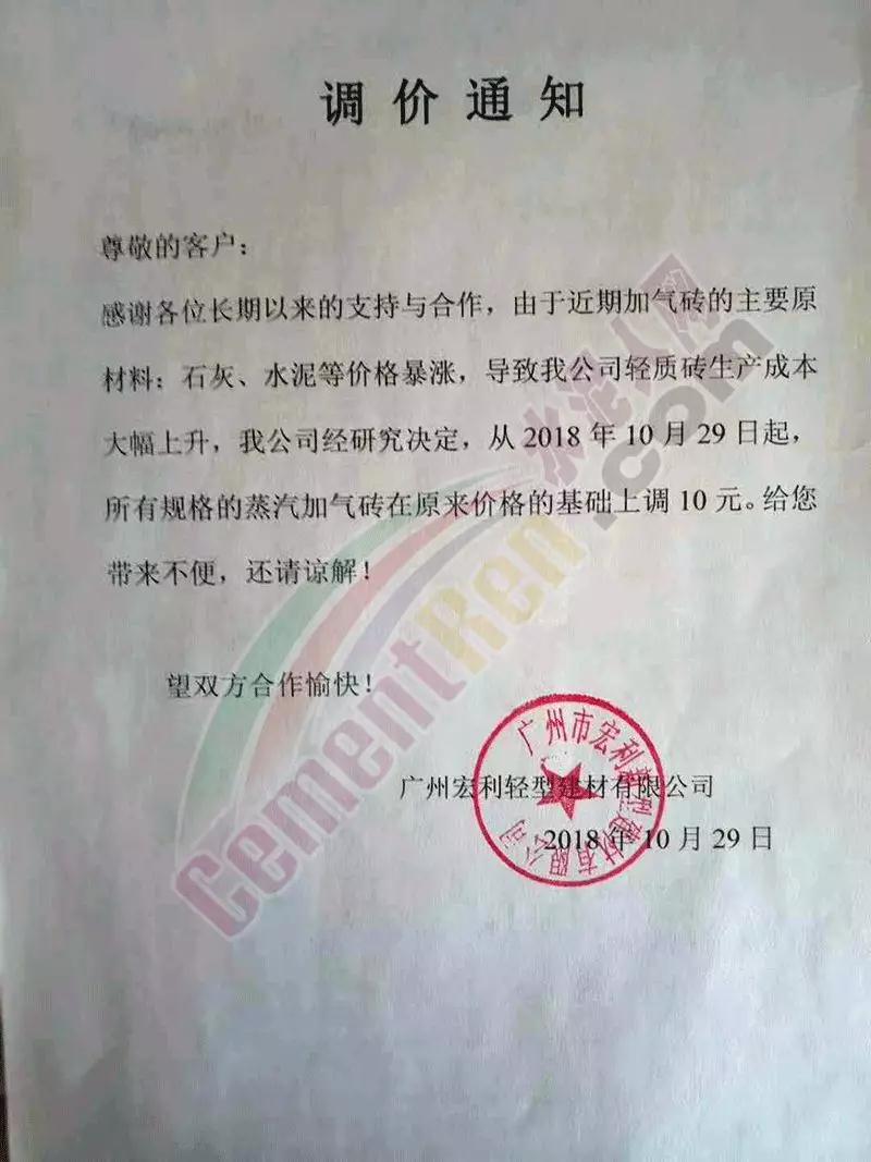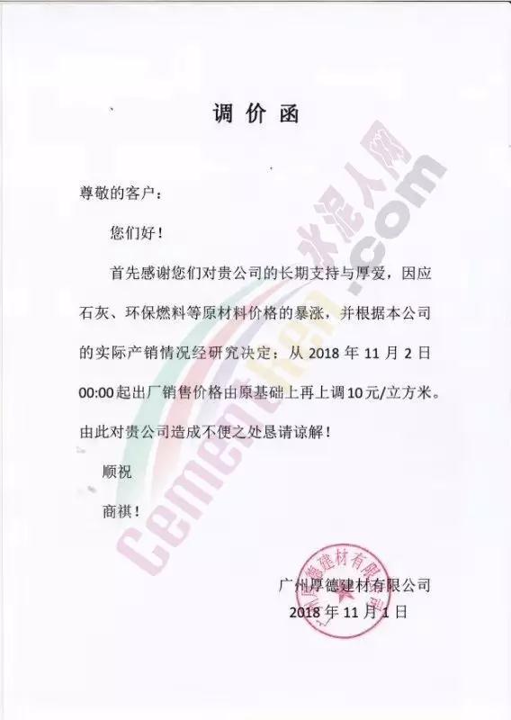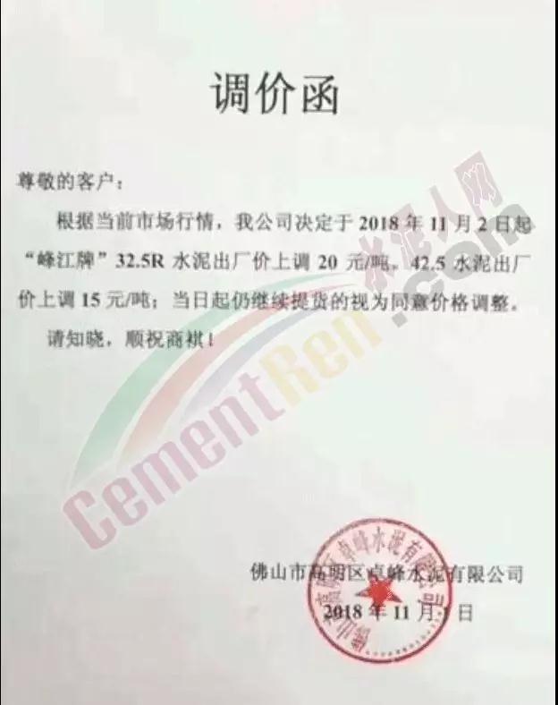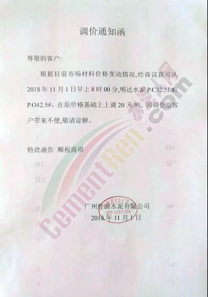 華南區域廣東、廣西區域水泥企業漲價通知函