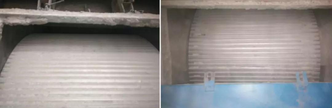 一、新材料合金輥優秀的耐磨性。以 JM 公司為例,該公司是一條年產 200 萬噸水泥的全能生產線,配有兩套 170/100 輥壓機+Φ4.2×13m 水泥粉磨圈流系統。輥壓機輥子原使用堆焊輥,運行功耗在 50~60%,入磨物料 R0.08 篩于 45%左右,2017 年 11 月改為新材料合金輥后,運行功耗在 70-85%,入磨物料 R0.08篩于 25%左右,發揮出輥壓機的優勢,系統能力大幅度提高。輥壓機累計運行7380 小時(期間輥面完好,相比于輥子更換前提高臺產約 20t/h)檢查輥面,條紋高度減少約 2.5mm,情況如圖: