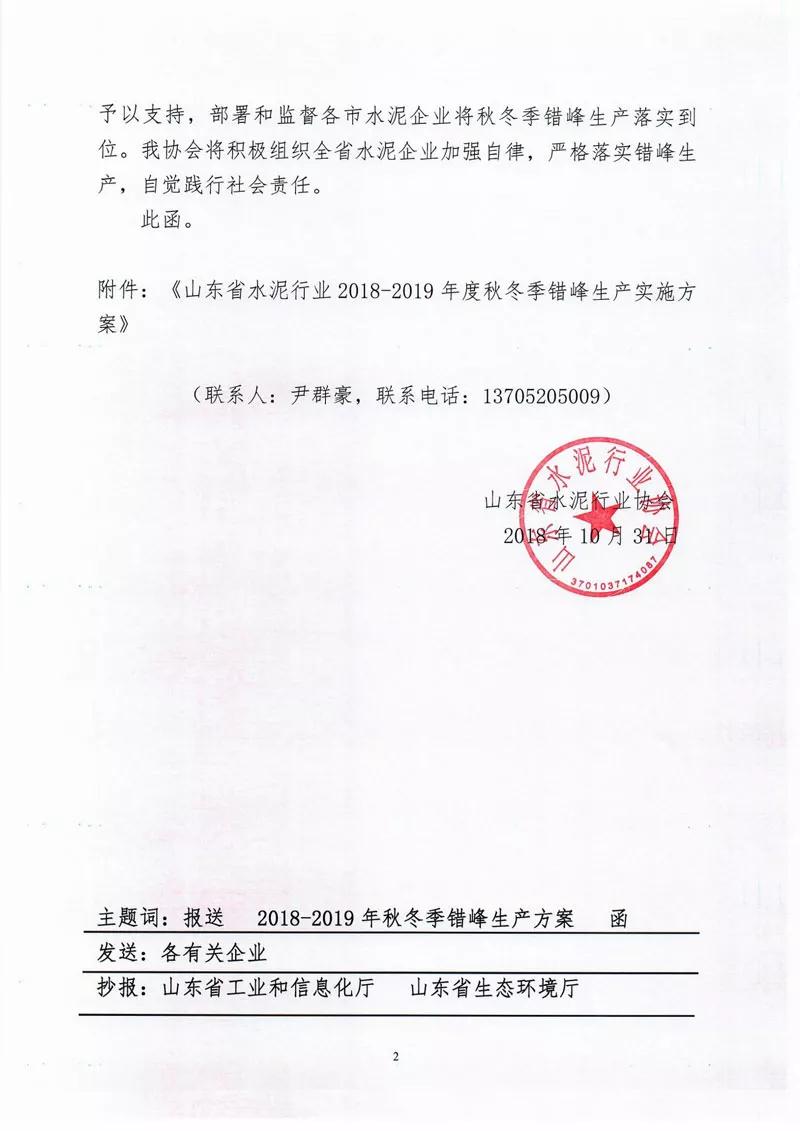 函件稱,根據(jù)10月26山東省經(jīng)信委、山東省環(huán)保廳聯(lián)合下發(fā)的《關(guān)于組織實施2018-2019年度重點行業(yè)秋冬季差異化錯峰生產(chǎn)的通知》(魯經(jīng)信原【2018】38號)及10月29日山東省多部門聯(lián)合下發(fā)的《關(guān)于山東省重點行業(yè)秋冬季差異化錯峰生產(chǎn)績效評價的指導(dǎo)意見》(魯環(huán)發(fā)【2018】7號)中“支持山東省水泥行業(yè)協(xié)會等組織根據(jù)行業(yè)情況制定錯峰生產(chǎn)方案,牽頭制定行規(guī)行約,協(xié)調(diào)督促企業(yè)加強(qiáng)自律,自覺執(zhí)行錯峰生產(chǎn)約定,履行社會責(zé)任”及“鼓勵支持山東水泥行業(yè)協(xié)會組織制定行業(yè)錯峰生產(chǎn)方案,并報各市相關(guān)部門備案”的要求,為科學(xué)組織山東省水泥行業(yè)秋冬季錯峰生產(chǎn),積極參加全省秋冬大氣污染綜合治理攻堅行動,在保證正常水泥市場供應(yīng)的同時,確保秋冬季污染物減排效果。經(jīng)廣泛征求意見,特制定《山東省水泥行業(yè)2018-2019年度秋冬季錯峰生產(chǎn)實施方案》,特報送各市經(jīng)信委、環(huán)保局、懇請予以支持,部署和監(jiān)督各市水泥企業(yè)將秋冬季錯峰生產(chǎn)落實到位。協(xié)會將積極組織全省水泥企業(yè)加強(qiáng)自律,嚴(yán)格落實錯峰生產(chǎn),自覺踐行社會責(zé)任。