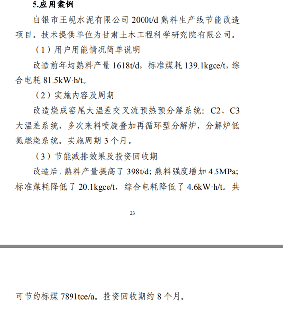 該技術適應于水泥窯預熱預分解系統提產、節能、降耗技術改造。可以提高熟料產量 10~25%;提高熟料強度 1.0~3.5MPa;降低燒成煤耗 2.9~4.5kgce/t;降低綜合電耗 3.5~5.0kW·h/t;降低廢氣中 NOx含量 100~150ppm。預計未來 5 年,推廣應用比例可達到 10%,可形成節能52.61 萬 tce/a,減排 CO2 136.79 萬 t/a。