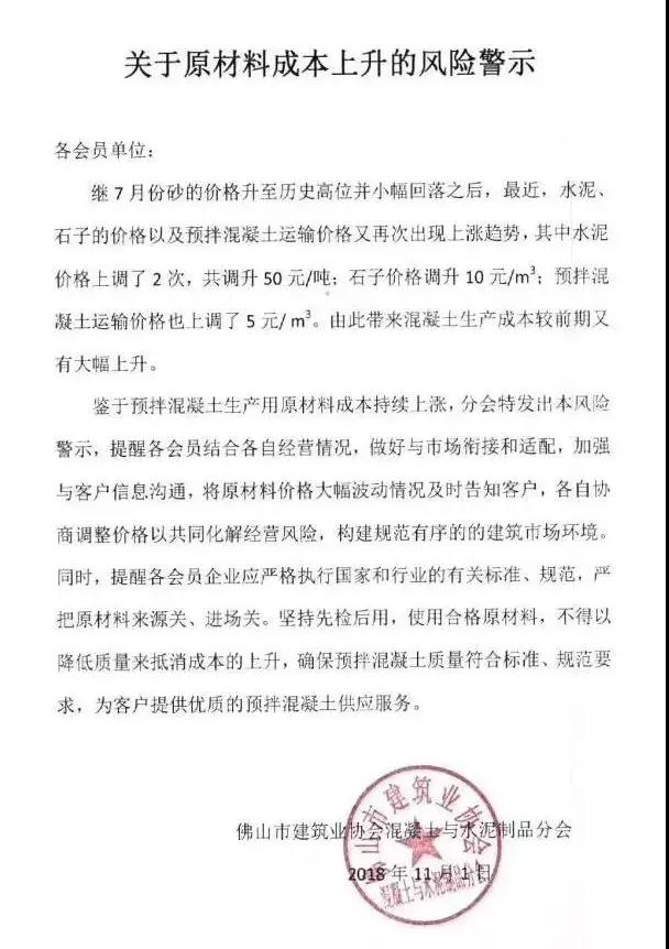 水泥行業在短短的一個月的時間內,一百多家水泥企業發布了幾輪漲價通知,價格漲幅可觀,已經造成部分地區出現停工現象。佛山市建筑業協會混凝土與水泥制品分會發布了《關于原材料成本上升的風險警示》文件,文件稱因近期水泥、石子價格及預拌混凝土運輸價格上漲,混凝土企業生產成本大幅上漲,分會特發風險警示,提醒會員結合各自經營情況,做好與市場銜接和適配,加強客戶信息溝通,將原材料價格大幅波動情況及時告知客戶。原文如下:
