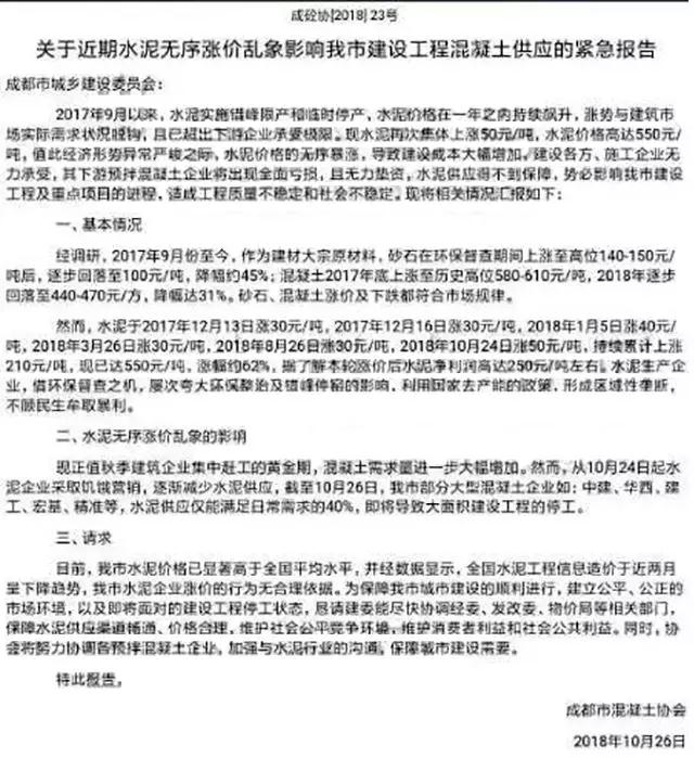 成都市混凝土協會給成都市城鄉建設委員會提交了《關于近期水泥無序漲價亂象影響我市建設工程混凝土供應的緊急報告》(成砼協「2018」23號)稱:水泥實施錯峰限產和臨時停產,水泥價格在一年之內持續飆升,漲勢與建筑市場實際需求狀況脫鉤,且已超出下游企業承受極限。