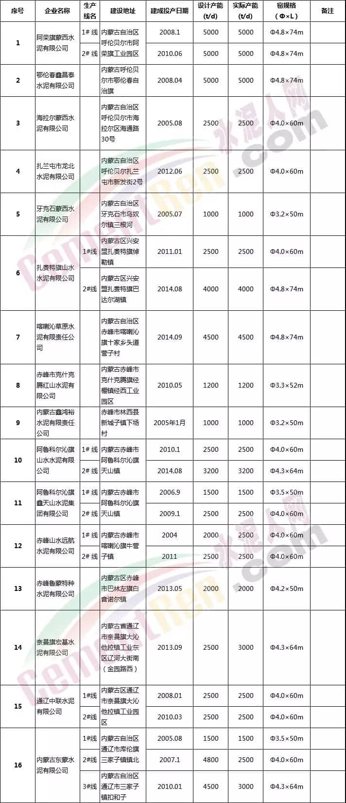 表一:呼倫貝爾市、興安盟、通遼市、赤峰市熟料生產企業