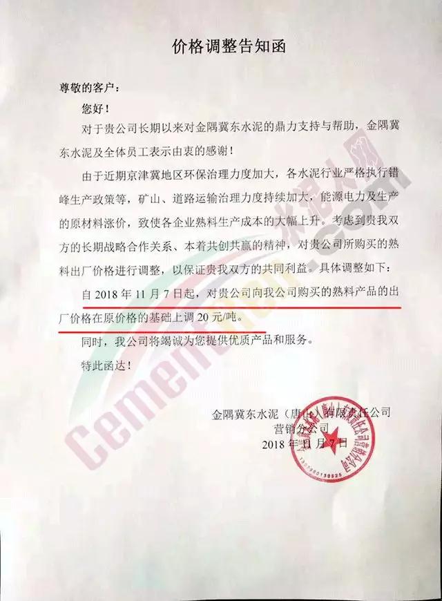 水泥人網(wǎng)通訊員消息:金隅冀東(唐山)有限責任公司營銷分公司、河北曙光強興水泥有限公司等企業(yè)于11月6日晚間發(fā)布《價格調(diào)整告知函》稱將于今日(11月7日)起,上調(diào)熟料出廠價,調(diào)價幅度20元/噸。