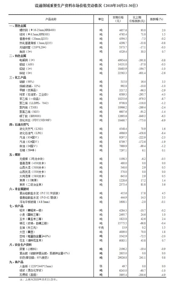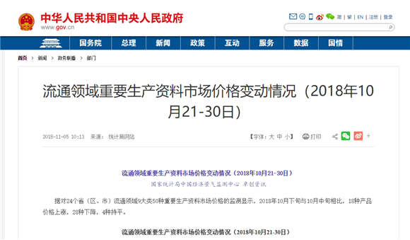 11月5日,中央人民政府網(wǎng)站發(fā)布,據(jù)對24個省(區(qū)、市)流通領(lǐng)域9大類50種重要生產(chǎn)資料市場價格的監(jiān)測顯示,2018年10月下旬與10月中旬相比,18種產(chǎn)品價格上漲,28種下降,4種持平。