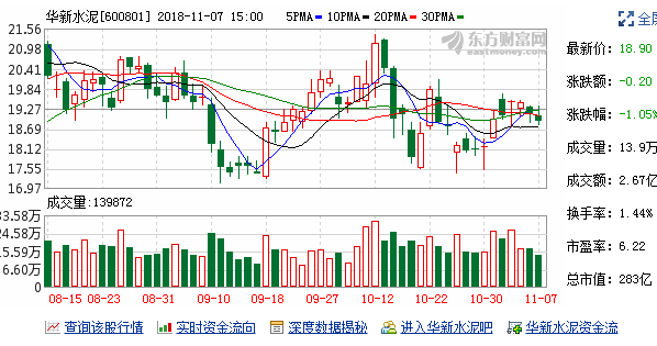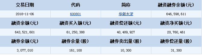 華新水泥(600801)2018-11-06融資融券信息顯示,華新水泥融資余額643,521,601元,融券余額3,077,010元,融資買入額61,250,388元,融資償還額40,489,927元,融資凈買額20,760,461元,融券余量161,100股,融券賣出量10,300股,融券償還量31,300股,融資融券余額646,598,611元。華新水泥融資融券詳細信息如下表: