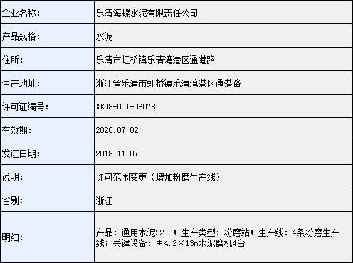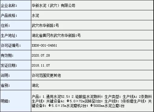 生產許可證變更中涉及多家水泥集團企業子公司,五家海螺水泥公司:安徽海螺水泥股份有限公司、樂清海螺水泥有限責任公司、乾縣海螺水泥有限責任公司;一家華潤水泥工廠華潤水泥(封開)有限公司;一家華新水泥工廠華新水泥(武穴)有限公司;一家金隅冀東工廠廣宗縣金隅冀東水泥有限公司;一家祁連山水泥甘谷祁連山水泥有限公司等。海螺水泥