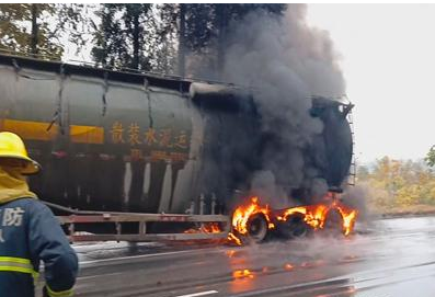 途中消防員迅速與報警人取得聯系,了解現場具體情況。經了解,是從山東開往睢寧方向一輛運輸水泥的罐車著火。中隊抵達現場,迅速鋪設水帶出水滅火,經過15分鐘左右的撲救明火被撲滅。據車主了解,是由于車子在行駛過程中爆胎引發起火的,主要燃燒部位為后輪胎。事故所幸沒有造成人員被困和受傷。