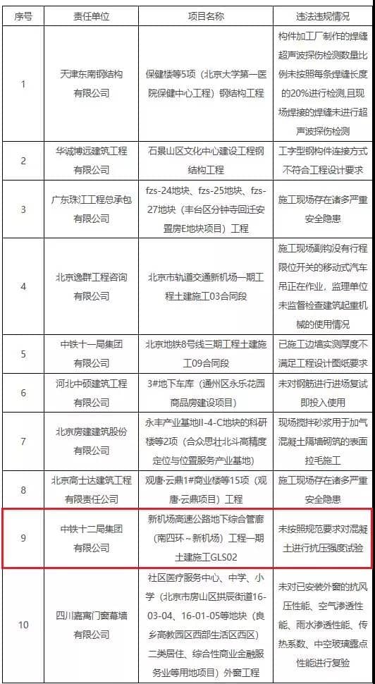 日前,北京市住房城鄉建設委集中通報10家安全質量違法違規企業,其中新機場高速公路地下綜合管廊(南四環~新機場)工程一期土建施工GLS02 因未按照規范要求對混凝土進行抗壓強度試驗被通報,項目責任單位為中鐵十二局集團有限公司。