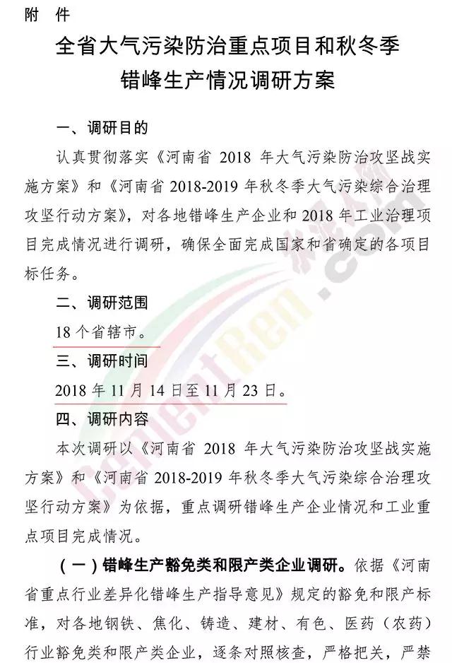 日前河南省發布《全省大氣污染防治重點項目和秋冬季錯峰生產情況調研方案》(以下簡稱“方案”)。《方案》稱此次調研目的是認真貫徹落實《河南省2018年大氣污染防治攻堅戰實施方案》和《河南省2018-2019年秋冬季大氣污染綜合治理攻堅方案》,對各地錯峰生產企業和2018年工業治理項目完成情況進行調研,確保全面完成國家和河南省確定的各項目標任務。調研時間為2018年11月14日至11月23日。