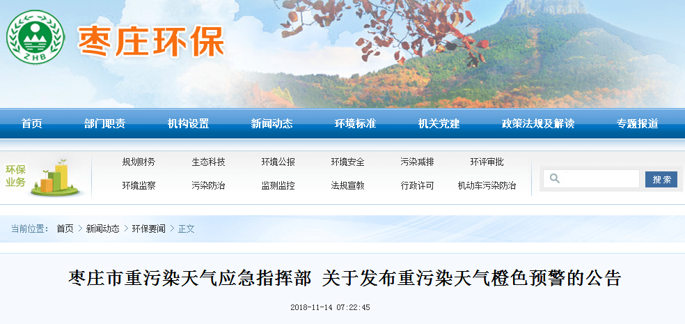 按照生態環境部統一部署,棗莊市重污染天氣應急指揮部依據《棗莊市重污染天氣應急預案(2018年修訂)》(棗氣綜指〔2018〕16號),于2018年11月14日7時發布重污染天氣橙色預警,定于2018年11月14日8時啟動重污染天氣Ⅱ級應急響應。