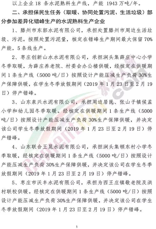 2、棗莊創新山水水泥有限公司,承擔澗頭集薛莊中心小學冬季取暖,為薛莊養老院、村委會辦公樓供暖,經核定在供暖期間1條生產線(5000噸/日)按照設計產能壓減生產負荷30%生產保障供暖,在學生冬季放假期間(2019年1月23日至2月19日)停產錯峰。