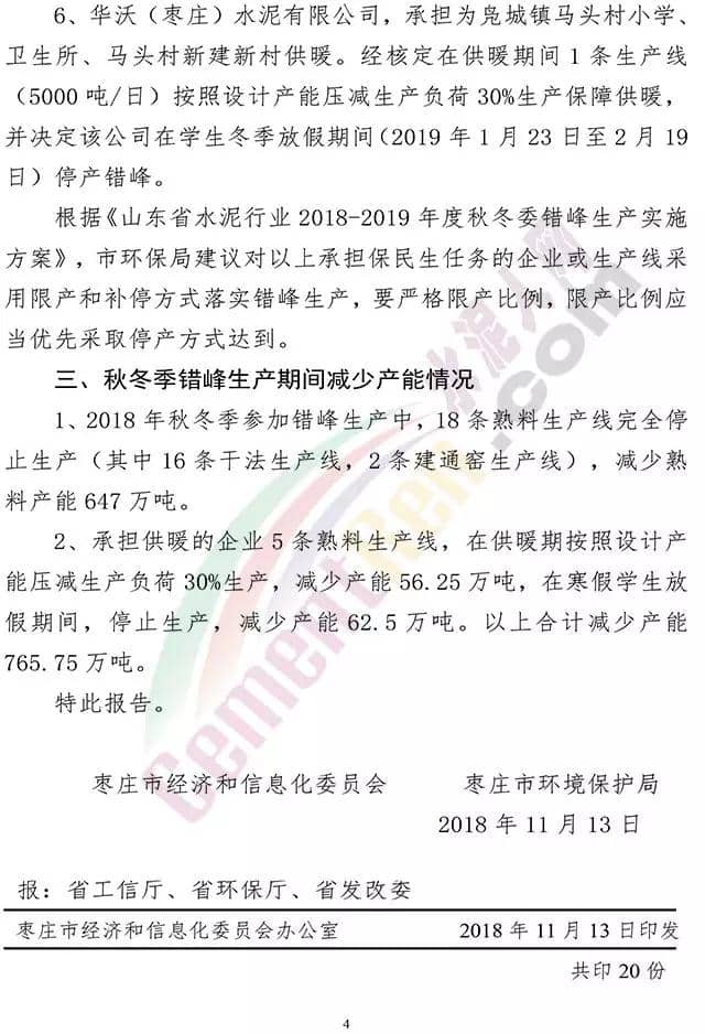 6、華沃(棗莊)水泥有限公司,承擔為鳧城鎮馬頭村小學、衛生所、馬頭村新建新村供暖。經核定在供暖期間1條生產線(5000噸/日)按照設計產能壓減生產負荷30%生產保障供暖,并決定該公司在學生冬季放假期間(2019年1月23日至2月19日)停產錯峰。