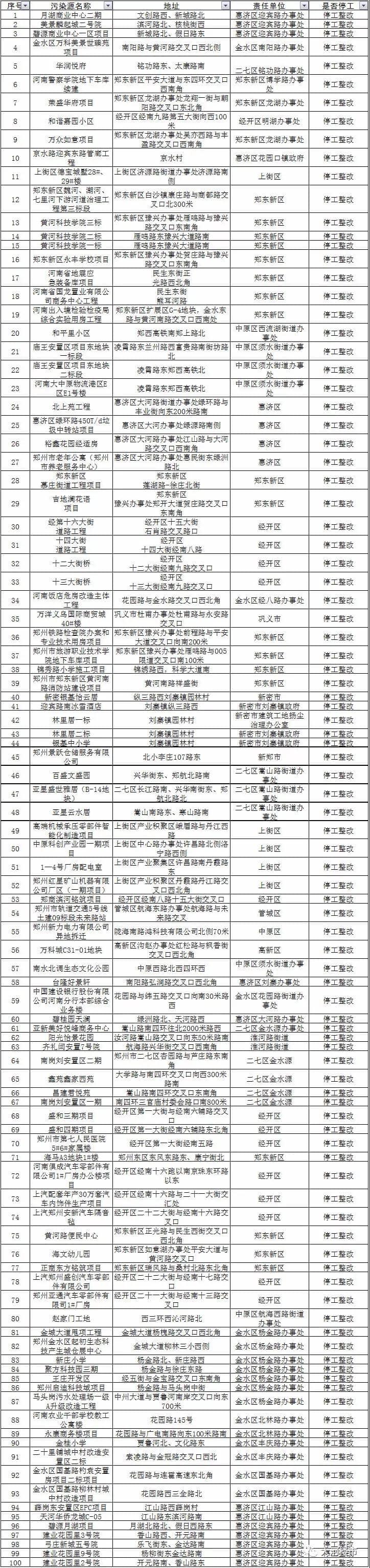 另據報道,由于未落實"八個百分之百"要求,鄭州市910個工地被停工。11月14日,鄭州市環保局公布910個被停工工地名單,以及存在的問題。