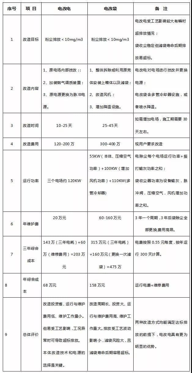通過以2500t/d熟料生產線為例的除塵改造對比,我們來看電改電、電改袋的各自優缺點: